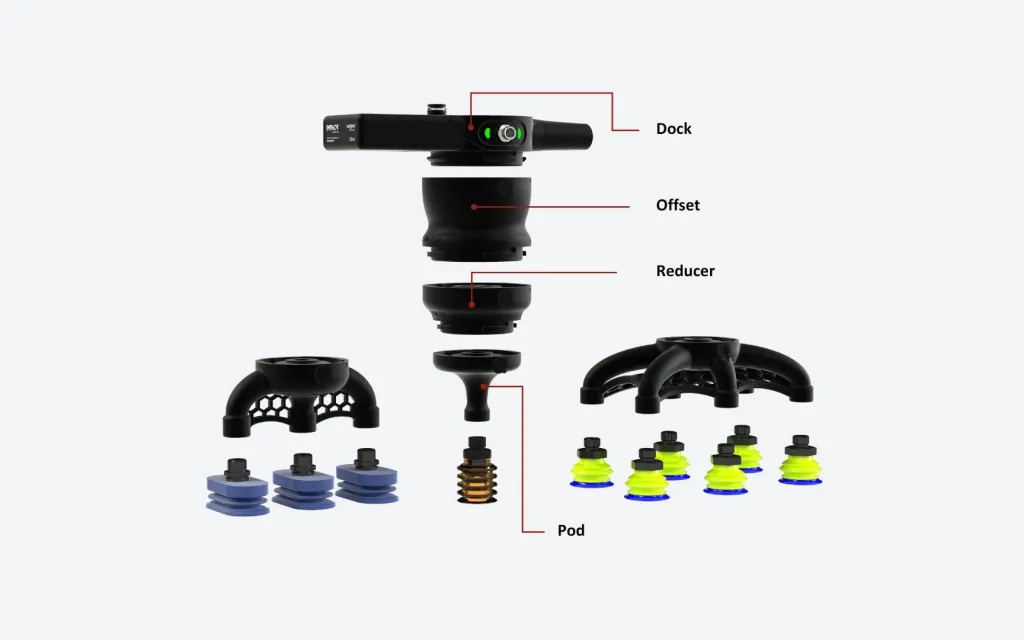 Pod – The vacuum interface where cups are mounted. Pods come in various layouts such as single-cup, 2×2, or 2×3, and support standard vacuum cups used across industries.